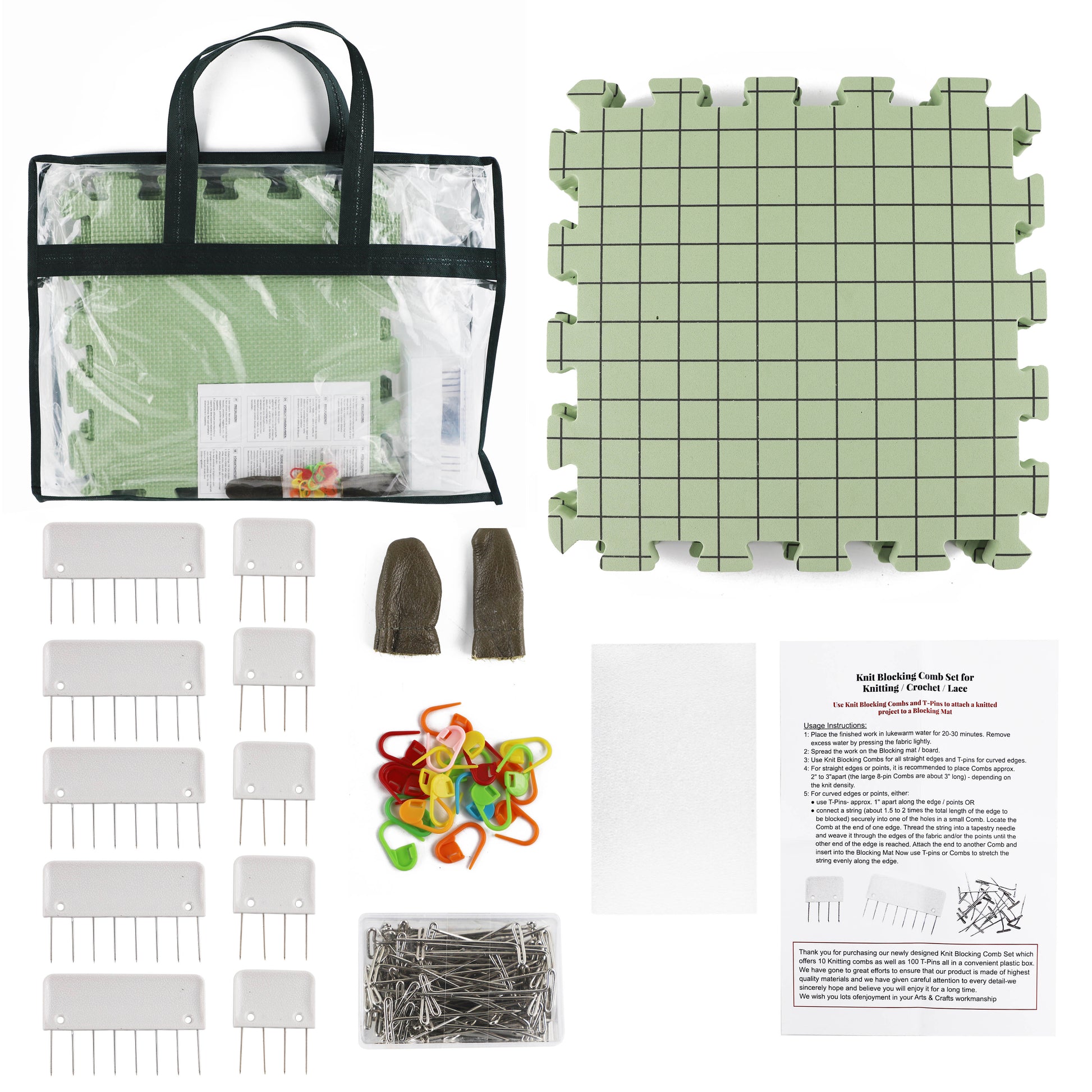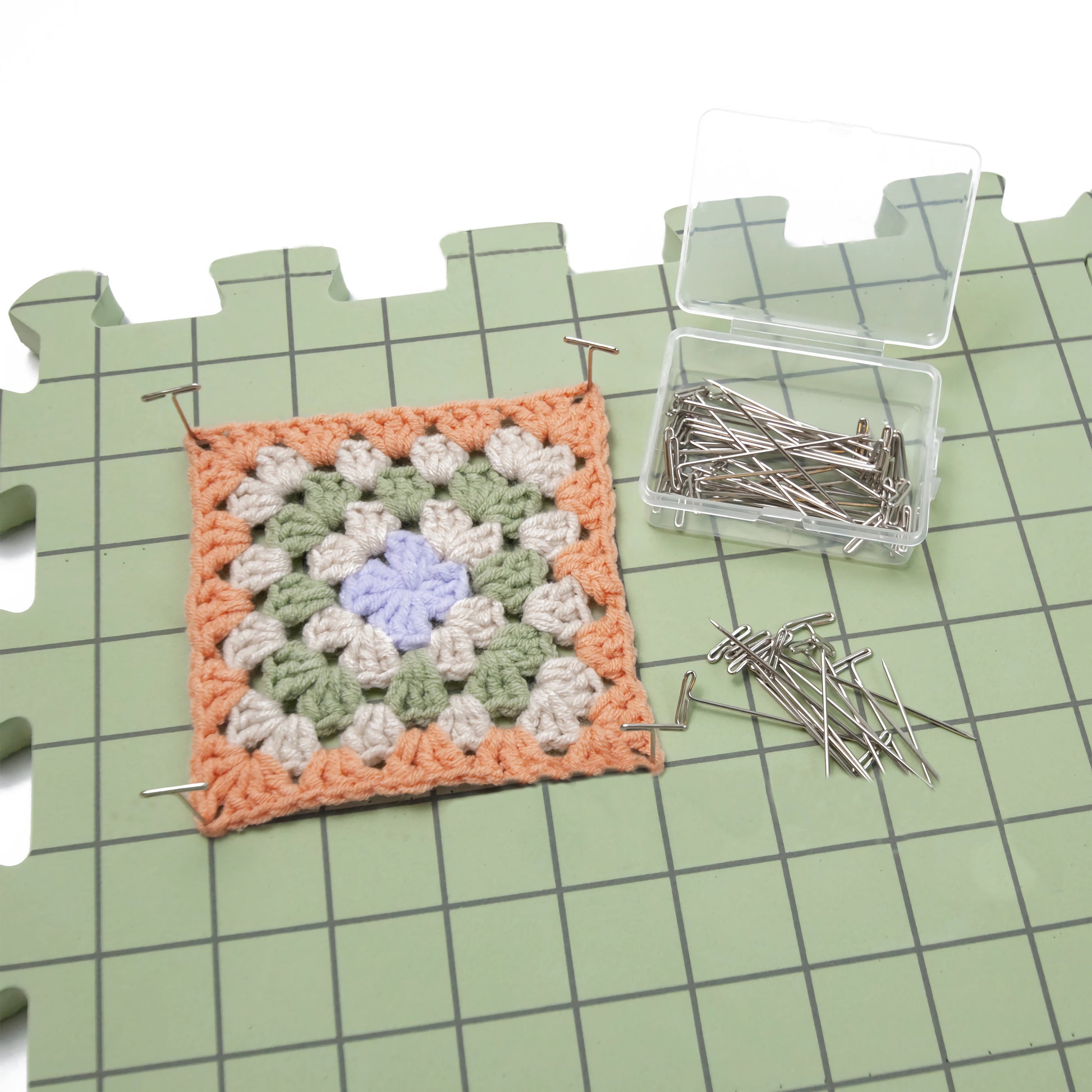- PACK IDEAL PARA BLOQUEO CROCHET GANCHILLO TEJER BORDADOS GRANNY SQUARE: Pack compuesto por 3 Tapetes de Espuma 32x32cm gruesos con cuadriculas, 5 Peines de Bloqueo de 8 Pines, 5 Peines de Bloqueo de 4 Pines, 100 Pines en forma de T, 20 Marcadores de Puntos, Protector de Dedos. Todo ello se incluye en una practica bolsa para guardar este completo Pack perfecto para bloquear tus creaciones de punto, tejidas, de ganchillo, crochet, bordados, …
